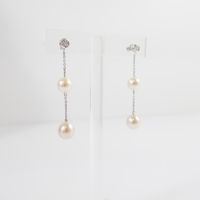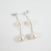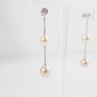 Paire de pendants d'oreilles : en or gris 750 mil. composé d'un petit pavage de diamants taille brillant retenant une chaîne à maillons forçat limé agrémentée de 2 perles de culture (longueur : 5 cm ; diamètre des perles : 8 et 9 mm). 5,1 g. brut.