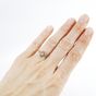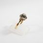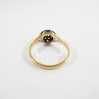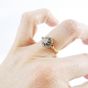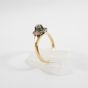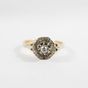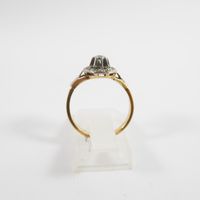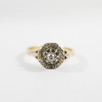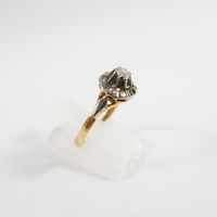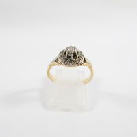 Bague : en deux ors 750 mil. à chaton légèrement octogonal centré d'un diamant taille brillant dans un entourage de diamants taille rose (TDD : 52) (diamètre : 8,8 mm environ) (petits éclats, manque une rose). 3 g. brut