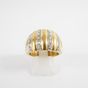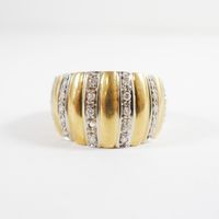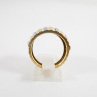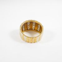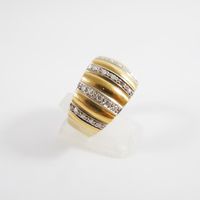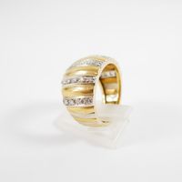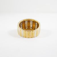 Bague bandeau : en deux ors 750 mil. à décor godronné et rayé, sertie de diamants taille brillant (TDD : 58) (largeur : 13,8 mm environ) (manque un diamant). 9,9 g. brut