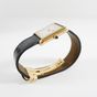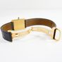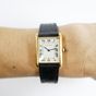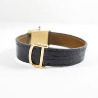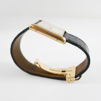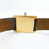 CARTIER "Tank", réf. 78086 : Montre-bracelet en or 750 mil., boîtier rectangulaire, cadran crème à chiffres romains peints, mouvement mécanique, bracelet en cuir noir usé, boucle déployante signée en or 750 mil., signée et numérotée (dimensions : 31 x 23 mm environ) (petit éclat sur le cabochon, signature et numéros partiellement effacés). 34,7 g. brut