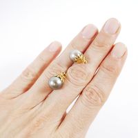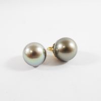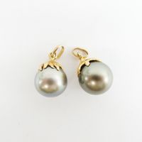 Deux pendentifs identiques : en or 750 mil. retenant chacun une perle de culture grise (diamètres perles : 10,5 et 11 mm environ) (hauteur : 2 cm environ). 5,1 g. brut