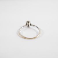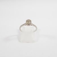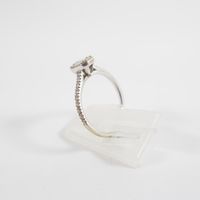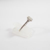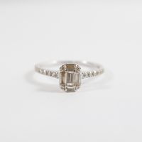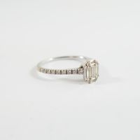 Fine bague : en or gris 750 mil. à chaton rectangulaire, sertie de diamants tailles baguette et brillant (TDD : 50) (dimensions : 6,5 x 5,2 mm environ). 1,8 g. brut