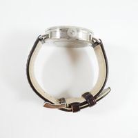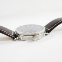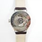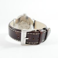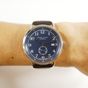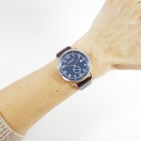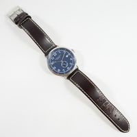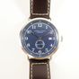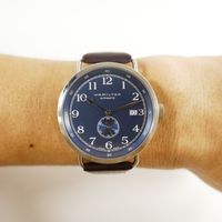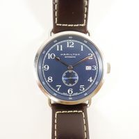 HAMILTON "Khaki Navy" : Montre-bracelet en acier, boîtier rond, cadran bleu nuit à chiffres arabes peints, guichet dateur à 3H, petite seconde à 6H, mouvement automatique apparent sous un fond de boîte transparent, bracelet en cuir brun, boucle ardillon signée en acier, signée (diamètre : 40 mm environ).