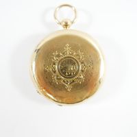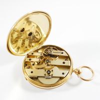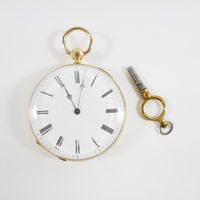 Montre de gousset : en or 750 mil., cadran émaillé blanc à chiffres romains peints, mouvement mécanique, dos ciselé et guilloché, accompagnée d'une clé en métal (diamètre : 43 mm environ) (fêles au cadran, petits chocs, rayures). 61,4 g. brut (hors clé)