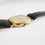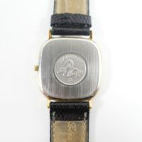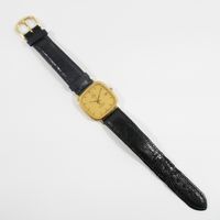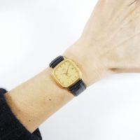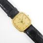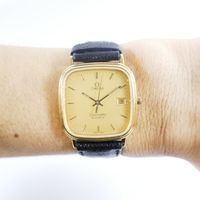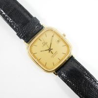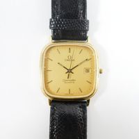 OMEGA "Seamaster", réf. 1430 : Bracelet-montre en métal doré et acier, boîtier coussin, cadran doré, index bâton, guichet dateur à 3H, mouvement à quartz, bracelet en cuir noir usé, boucle ardillon en métal doré (dimensions : 29 x 29 mm environ) (rayures, usures, manque matière luminescente).