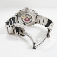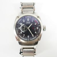ORIS "BC4 Small Second, Pointer Day", réf. 7617 : Montre-bracelet en acier, boîtier coussin, cadran noir à chiffres arabes peints luminescents, petite seconde à 9H, guichet dateur à 3H, mouvement automatique, bracelet et boucle déployante signée en acier, accompagnée de son écrin, sa boîte, trois maillons supplémentaires et deux livrets (diamètre : 42 mm environ) (longueur : 18 cm environ) (salissures, usures, écrin et boîte très sales et endommagés).