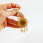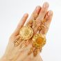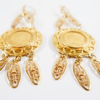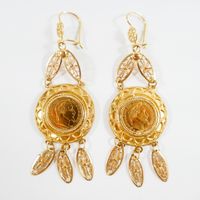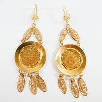 Paire de pendants d'oreilles à pampilles : en or 750 mil. chacun composés de maillons filigranés et centrés d'une pièce de 10 FRF, travail français (longueur : 10,3 cm environ) (diamètre : 3,3 cm environ). 28,2 g.