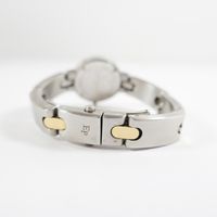 PEQUIGNET "Moorea", Bracelet-montre de dame : en acier et métal doré, boîtier rond, lunette sertie de diamants taille brillant, cadran argenté, index points appliqués luminescents, mouvement à quartz, bracelet et boucle déployante papillon siglée en acier et métal doré, signé et numéroté (diamètre : 24 mm environ) (longueur : 15 cm environ).