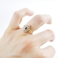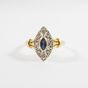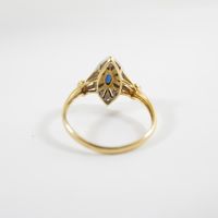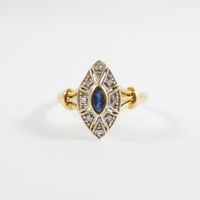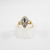 Petite bague marquise : en deux ors 750 mil. sertie d'un saphir taille navette dans un entourage de diamants taille 8/8 (TDD : 53) (dimensions : 13,8 x 7,7 mm environ). 2,3 g. brut