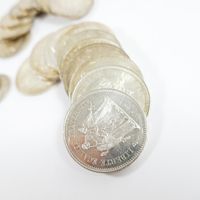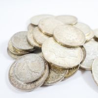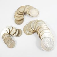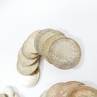 Vingt-neuf pièces de monnaie : en argent 900 mil. dont dix de 50 FRF (Hercule), neuf de 10 FRF (Hercule) et dix de 5 FRF (Semeuse) (usures). 645 g.