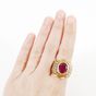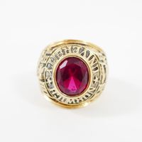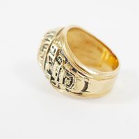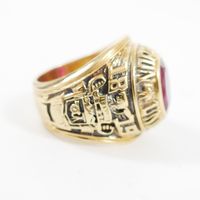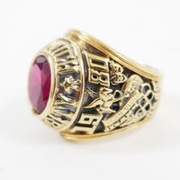 Bague de promotion : des cadets de l'université de Norwich de l'année 1980 (Vermont, USA). En or 750 mil. Ornée d'une pierre imitation rouge. (Largeur : 2,3 cm environ) (TDD : 62). 29,8 g. brut.