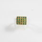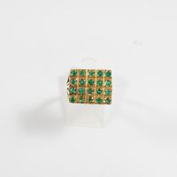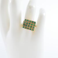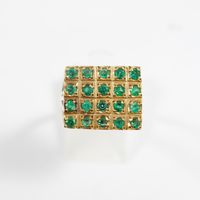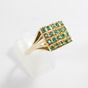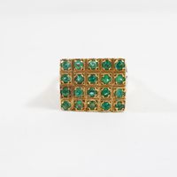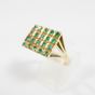 Bague en or 585 mil à plateau rectangulaire (Dim : 1,2 x 1,5 cm environ) rehaussé de pierres vertes (2 pierres cassées, égrisures) (TDD : 55). 5,5 g brut.