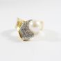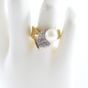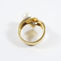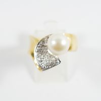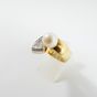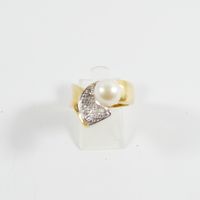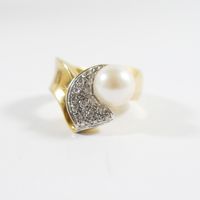 Bague en or 750 mil ornée d'une perle de culture (Diam : environ 8,3 mm) rehaussée de diamants (Larg : 1,4 cm environ ; TDD : 55). 11,3 g brut.