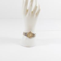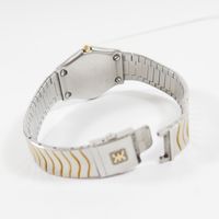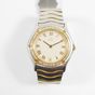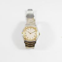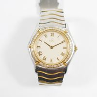 E) Art L833-2 du code de Commerce : Bracelet-montre de dame en or 750 mil et acier, boîtier rond à lunette en or 750 mil diamantée (Diam : 27 mm), cadran beige à chiffres romains, tour de bras à plaquettes en vague en acier et métal doré (Long : 17,5 cm environ) EBEL mouvement quartz. 41,9 g brut.
