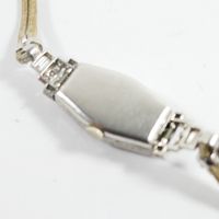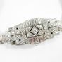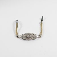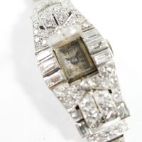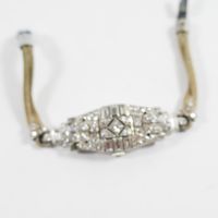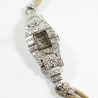 Montre à cache en platine 850 mil entièrement rehaussée de diamants sur cordon (Long : 15 cm environ) , boîtier tonneau (Dim : 2,5 x 1,6 mm environ), cadran argenté taché à chiffres arabe, mouvement mécanique (boucle métal). 21,6 g brut.
