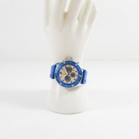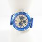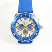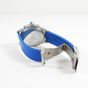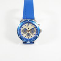 Montre d'homme en acier sur bracelet caoutchouc bleu (Long : environ 22 cm) chronographe à boîtier rond (Diam : 43 cm) à lunette tournante graduée bleue, cadran argenté à index bâton bleu, 3 compteurs secondaires et guichet dateur à 4h, MAUBOUSSIN "Bande d'arret d'urgence" mouvement quartz.