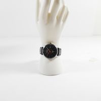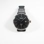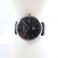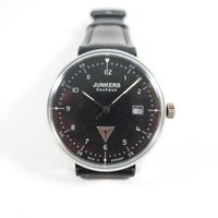 Montre en acier sur bracelet cuir usagé, boîtier rond (Diam : 40 mm), cadran noir à chiffres arabe et guichet dateur, JUNKERS "Bauhaus" mouvement quartz.