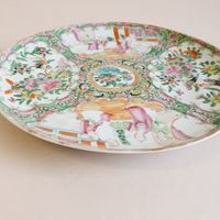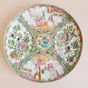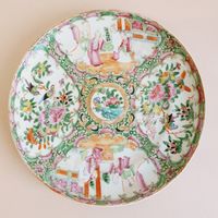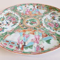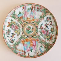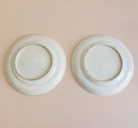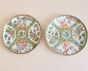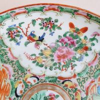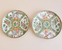 CHINE, Canton, fin du XIXème siècle : Deux assiettes en porcelaine blanche à décor en émaux polychromes et or de scènes d’intérieur et pivoines, volatiles et insectes branchés s’inscrivant dans des réserves polylobées. Diamètre : 21,5 cm. (Usures, légers éclats)