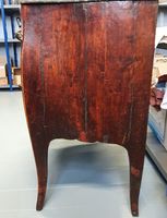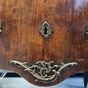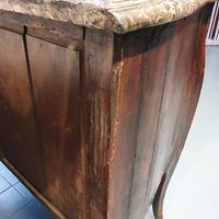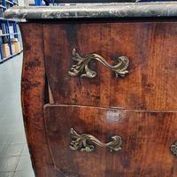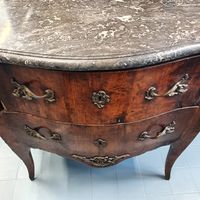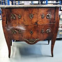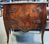 Commode galbée en bois de placage, ouvrant à deux tiroirs, entrées de serrure et poignées de tirage en bronze ciselé, dessus de marbre gris, estampille de Charles Joseph DUFOUR, reçu Maître ébéniste en 1759, et marque de jurande. Epoque Louis XV. Dimensions : 87 x 98 x 55 cm. (Bronzes et marbre rapportés) (Accidents et manques)
