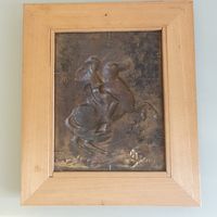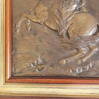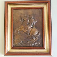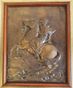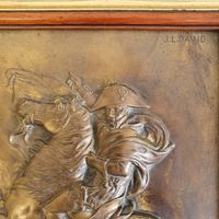 Ecole française du début du XXème siècle : d'après Jacques-Louis DAVID (1748-1825) "Bonaparte franchissant le col du Grand Saint-Bernard" Plaque en bronze en bas-relief à patine brune. Dimensions : 23,55 x 18 cm. (Encadrée)