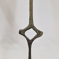 Félix AGOSTINI (1910-1980) : "Chimène" Applique en bronze (non patiné) à deux montants profilés losangés reliés par une traverse composée d'anneaux. Trace de signature. Dimensions : 75 x 19 x 6 cm. Nous remercions l'ayant droit de nous avoir confirmé l'authenticité de cette oeuvre