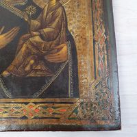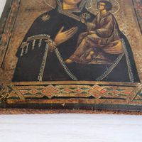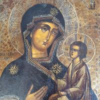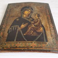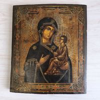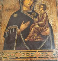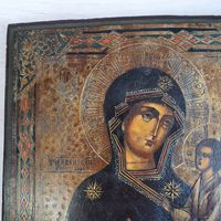 Icône de la Mère de Dieu de Tikhvine : Tempera sur bois. RUSSIE, XIXème siècle. Dimensions : 31 x 27 cm. (Restaurations, manque un tasseau)
