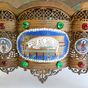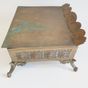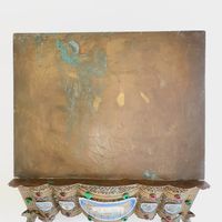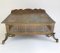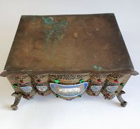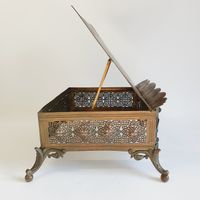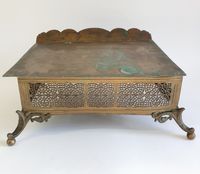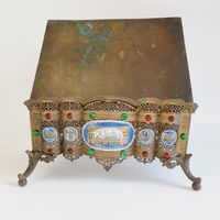 Lutrin d'autel : en laiton ciselé et doré à décor ajouré de feuillages et incrustations de cabochons de verre, orné de médaillons émaillés, le central représentant l'Agneau pascal entouré des symboles des quatre évangélistes, le plateau à inclinaison gravé JHS. Travail du XIXème siècle. Dimensions fermé : 19 x 38 x 32 cm. (Oxydations, déformations)