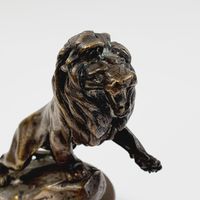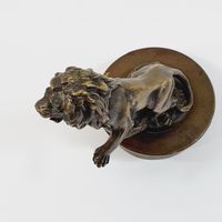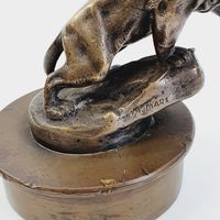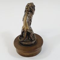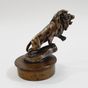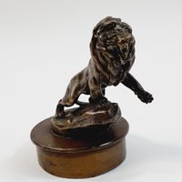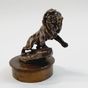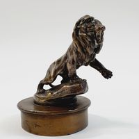 Maurice Roger MARX (1872-1956) : Mascotte automobile en bronze à patine médaille figurant le "Lion Peugeot" rugissant. Signée sur la terrasse, montée sur un bouchon. Hauteur totale : 15,5 cm.