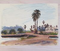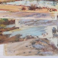 Michel HERTZ (1933-2022) : "Vallée du Jourdain, 2004" Cinq pastels sur papier. Monogrammés et ancre de marine. Dimensions : différents formats de 24,5 x 34,5 cm à 29,5 x 42 cm. (Non encadrés)