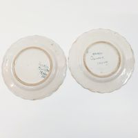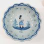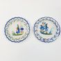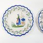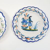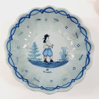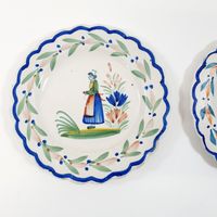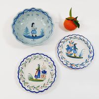 QUIMPER, XXe siècle : Ensemble en faïence polychrome à bord festonné, décor de Bretons en costumes traditionnels : - 2 petites assiettes de présentation sur fond blanc, marques Henriot (diamètre : 16,5 cm), - 1 coupelle sur fond bleuté (diamètre : 18,5 cm) (Léger fêle).