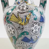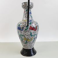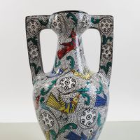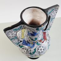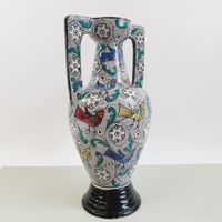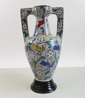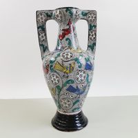 TUNISIE, Nabeul : Vase amphore à deux anses en faïence polychrome à décor d'oiseaux sur fond blanc tapissant de pointillés noirs. Pas de marque. Hauteur : 43 cm. (Petits éclats)