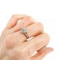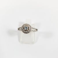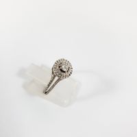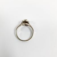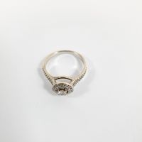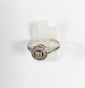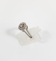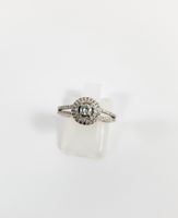 Bague : en or rhodié 750 mil., le centre de forme ronde orné d’un diamant brillanté en serti griffes dans un entourage et entre deux lignes de diamants 8/8. (TDD 52,5) (2 pierres manquantes). 2,8 g. brut.