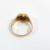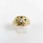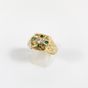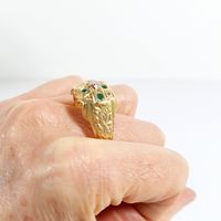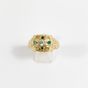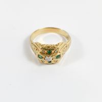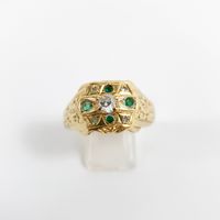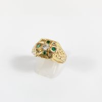 Bague : en or 585 mil. ciselé centré d'un diamant TA de 0,25 carat environ, encadré d'émeraudes. (TDD : 70) (1 pierre cassée). 9 g. brut.
