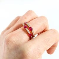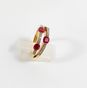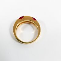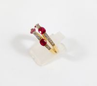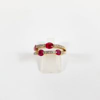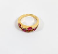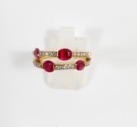 Bague double jonc : en or jaune 750 mil. ornée de rubis ovales, rehaussée d'une ligne de diamants brillantés. (TDD : 55,5). 7,3 g. brut.