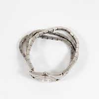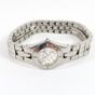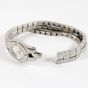 BAUME et MERCIER "Linéa" : Bracelet-montre de dame en acier, boîtier rond à lunette rehaussée de diamants (diamètre : 27 mm environ), cadran muet rayonnant argenté parsemé de diamants 8/8, certains teintés, bracelet à 3 lanières composé de maillons carrés articulés en acier, fermoir invisible, réf. 65347, mouvement à quartz. (Longueur : 19,5 cm environ).