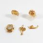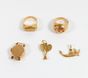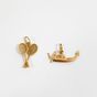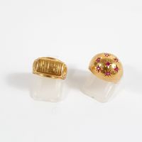Lot en or 750 mil. comprenant : 2 pendentifs "Paire de raquettes de tennis" et "Gondole", 2 bagues (pierres imitation) (TDD : 52,5 et 53) (Chiffrée), et 1 boîtier de montre de dame, mouvement mécanique (diamètre : 16 mm environ) (Oxydations au cadran). 19,5 g. brut.