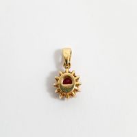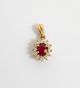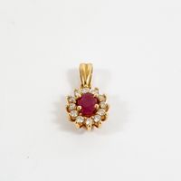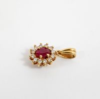 Pendentif : en or 750 mil. centré d'un rubis ovale dans un entourage de diamants brillantés en serti griffes (Hauteur avec bélière : 1,8 cm environ). 1,9 g. brut.
