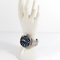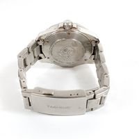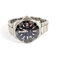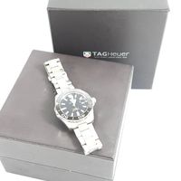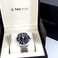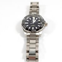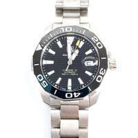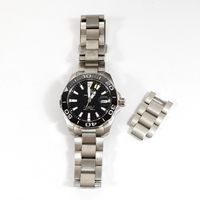 TAG HEUER "Aquaracer, calibre 5" : Bracelet-montre d'homme en acier, boîtier rond à lunette tournante en céramique (diamètre : 40 mm), cadran noir rainuré à index, guichet dateur à 3H, bracelet à plaquettes articulées (Longueur : 18 cm environ), mouvement automatique. Avec livret, Carte de garantie, 3 maillons supplémentaires, écrin et boîte. (Rayures, salissures).