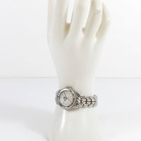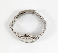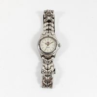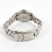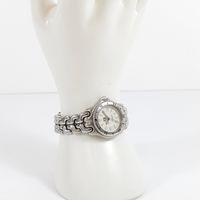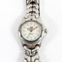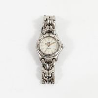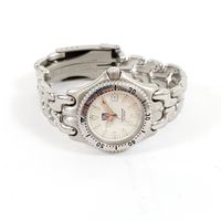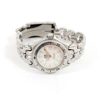 TAG HEUER "Professional" : Bracelet-montre de dame en acier, boîtier rond à lunette tournante graduée (diamètre : 29 mm), cadran blanc à index bâtons, guichet dateur à 3H, bracelet à plaquettes articulées et boucle déployante, mouvement à quartz. (Longueur : 16 cm environ).