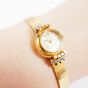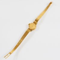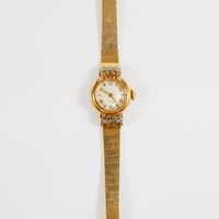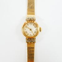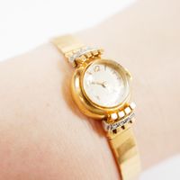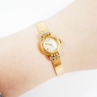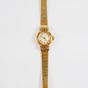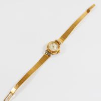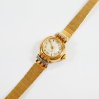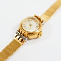 EB SUISSE : Bracelet-montre de dame deux ors 750 mil., boîtier rond à agrafes rayonnantes rehaussées de diamants 8/8, cadran champagne à chiffres arabes et index, mouvement mécanique, sur bracelet articulé en or 750 mil. à maillons polis, fermoir échelle à rabat. (Diam. : 19 mm ; Longueur : 17,5 cm environ). (Eclats au verre). 27,1 g. brut