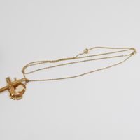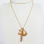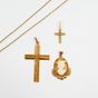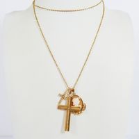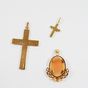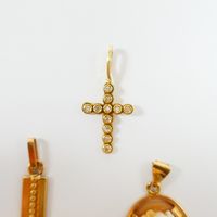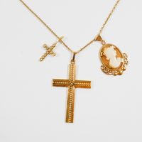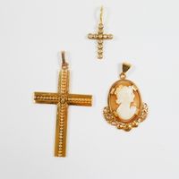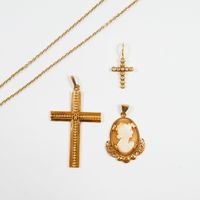 Lot en or 750 mil. comprenant : - 1 collier à maille forçat (longueur : 61 cm), - 2 pendentifs croix dont 1 chiffrée et l'autre sertie de diamants 8/8 (Haut. : 3,9 cm et 1,5 cm), - 1 pendentif médaillon serti d'un camée sur coquillage gravé d'un profil d'élégante (haut : 2,4 cm). Poids total brut : 8 g.