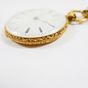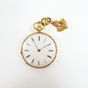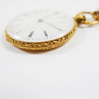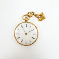 Montre de gousset en or 750 mil., dos et lunette ciselé de rinceaux fleuris, cadran blanc à chiffres romains, mouvement mécanique, cuvette en or 750 mil. Poinçon tête de médecin grec 1838-119. Avec sa clef de remontage en or 750 mil. (Diam. : 39 mm). 34,8 g. brut