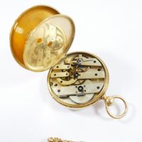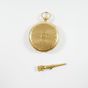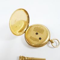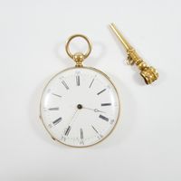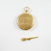 Montre de gousset en or 750 mil., dos guilloché, cadran blanc à chiffres romains et arabes, mouvement mécanique, cuvette en or 750 mil. Poinçon tête de cheval Départements 1838-1919. Avec sa clef de remontage en or 750 mil. (enfoncement). (Diam. : 50 mm). (Verre rayé). 77 g. brut