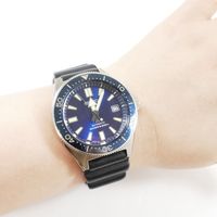 SEIKO, modèle Prospex Diver's 200, réf. 6R15-03W0 : Montre-bracelet d'homme de plongée en acier, boîtier rond, cadran bleu à index luminescents et guichet dateur à 3H, mouvement automatique, sur bracelet en caoutchouc à boucle ardillon signée. Signée et numérotée. (Diam.: 43 mm).