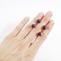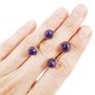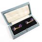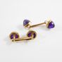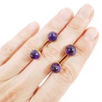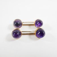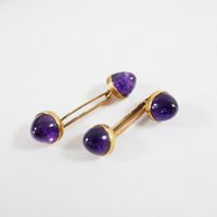 Paire de boutons de manchettes : en or 750 mil. ornés chacun de deux cabochons d'améthyste, numérotés, accompagnée de leur écrin en maroquin (usé) (une pierre cassée à la base). 6,8 g. brut