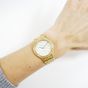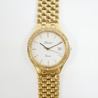 PRESTIGE, Bracelet-montre : en or 750 mil., boîtier rond, lunette sertie de diamants taille brillant, mouvement à quartz, bracelet et boucle à cliquet en or 750 mil. (diamètre : 34 mm environ) (longueur : 20 cm environ) (éclats, rayures, usures). 71,8 g. brut