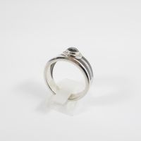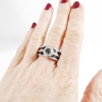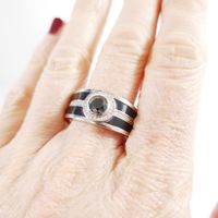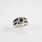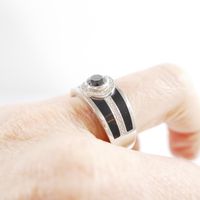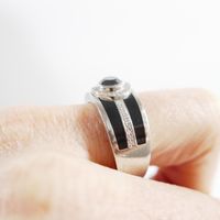 MAUBOUSSIN "L’Oeuvre Noire" : Bague bandeau en platine 950 mil. centrée d’un diamant noir taille brillant de 0,70 carat environ, entouré et épaulé de petits diamants blancs taille brillant, rehaussée de laque noir. Signée et numérotée. (TDD : 66) (chiffrée). 18,1 g. brut.