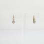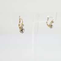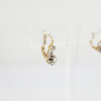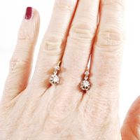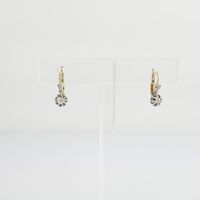 Paire de dormeuses : 2 ors 750 mil. serties chacune d'un petit diamant taille ancienne et de roses (hauteur : 1,5 cm) (1 accidentée). 3 g. brut.