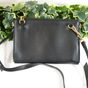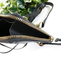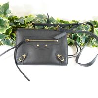 BALENCIAGA. Pochette "Néo Classic" : en cuir noir. Fermeture éclair sur les côtés et le dessus. Intérieur en cuir, poche plaquée. Poche zippée devant. Balenciaga embossé dans le cuir. Deux boucles décoratives sur le devant. Garniture en métal doré. Anse bandoulière amovible réglable. Made in Italy. H : 16 x L : 22 x P : 2 cm environ. Copie de la facture (2022). Bon état général, quelques traces à l'intérieur.