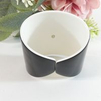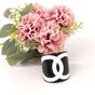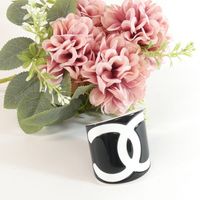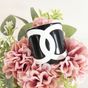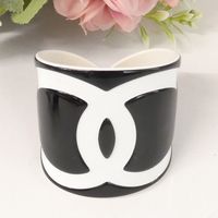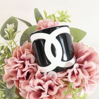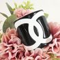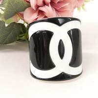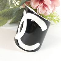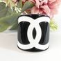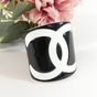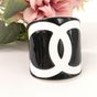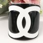 CHANEL. Bracelet manchette ouvert en résine bicolore : fond noir, et le logo CC iconique en blanc, Collection Continue 2006 par Karl Lagerfeld . Signé sur plaque : un minuscule cartouche Chanel en argent est situé sur le dessous et estampillé "Chanel 06 V Made in France". Diamètre : 5,5cm. Largeur : 6cm. Taille XS tour de poignet très petit (13cm environ), bracelet peu flexible. Quelques rayures.